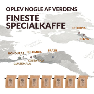 Oplev nogle af verdens bedste specialkaffer i vores Tasting Box gaveæsker. Her får du 7 af vores yndlings specialkaffer fra 7 forskellige lande, ristet til perfektion i vores risteri i Middelfart. Æskerne fås også som en 14 stk. gaveæske. Perfekt til at dele.